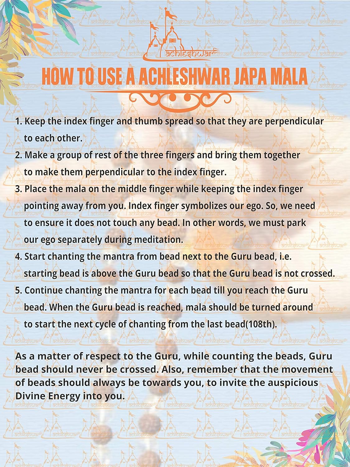 Achleshwar 108+1 Beads Vaijayanti Mala (Off White) is a sacred prayer garland used for Japa, meditation, chanting, puja, and daily spiritual practices. Crafted with 108+1 natural beads, it is ideal for wearing during meditation and devotional rituals.