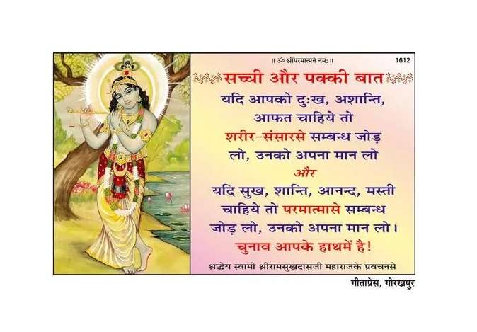 Gitapress Sachchi Aur Pakki Baat (Code-1612) :- "गीताप्रेस की पुस्तक 'सच्ची और पक्की बात' (कोड-1612)" एक विशेष पुस्तक है जो भगवान विष्णु के बहुरंगी चित्रों के साथ ब्रह्मलीन श्रद्धेय स्वामी श्रीरामसुखदासजी महाराज के प्रवचनों से उद्धृत १११-२ और ७१-४ ज्ञान के आर्टपेपर पर छपा हुआ सुंदर पोस्टर है।