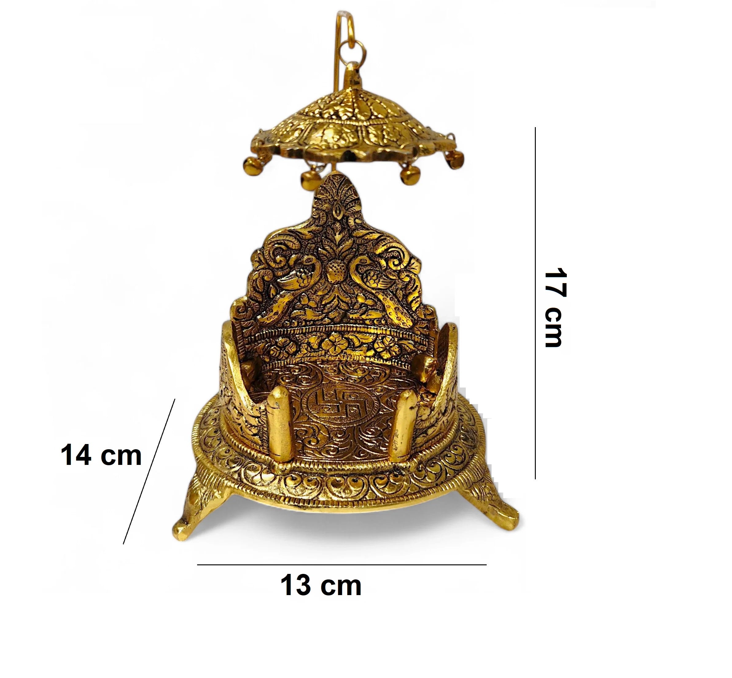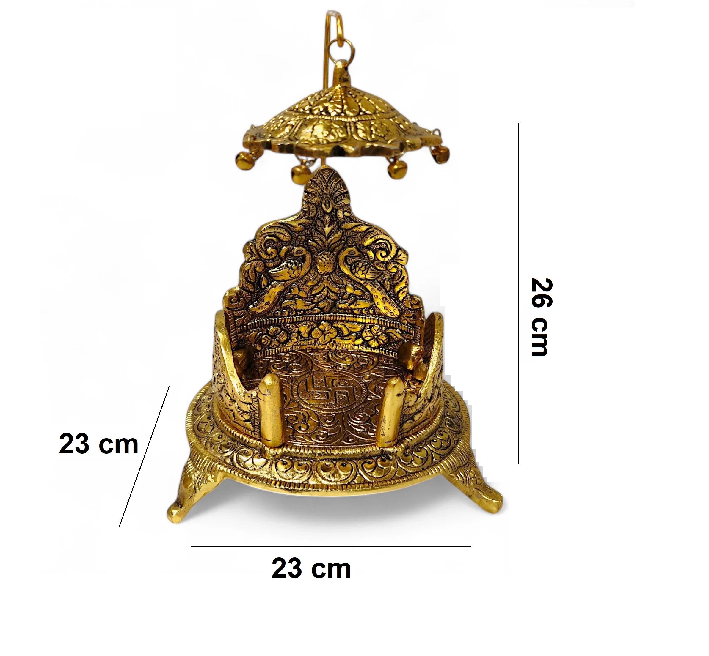 Bring divine elegance to your worship space with this beautifully crafted Antique Gold Aluminium Singhasan designed especially for Laddu Gopal, Krishna, and small deity idols. Made from high-quality aluminium with an antique gold finish, this singhasan reflects traditional artistry and devotion. Its intricate floral engravings and auspicious Swastik design on the seat symbolize positivity, prosperity, and divine blessings.