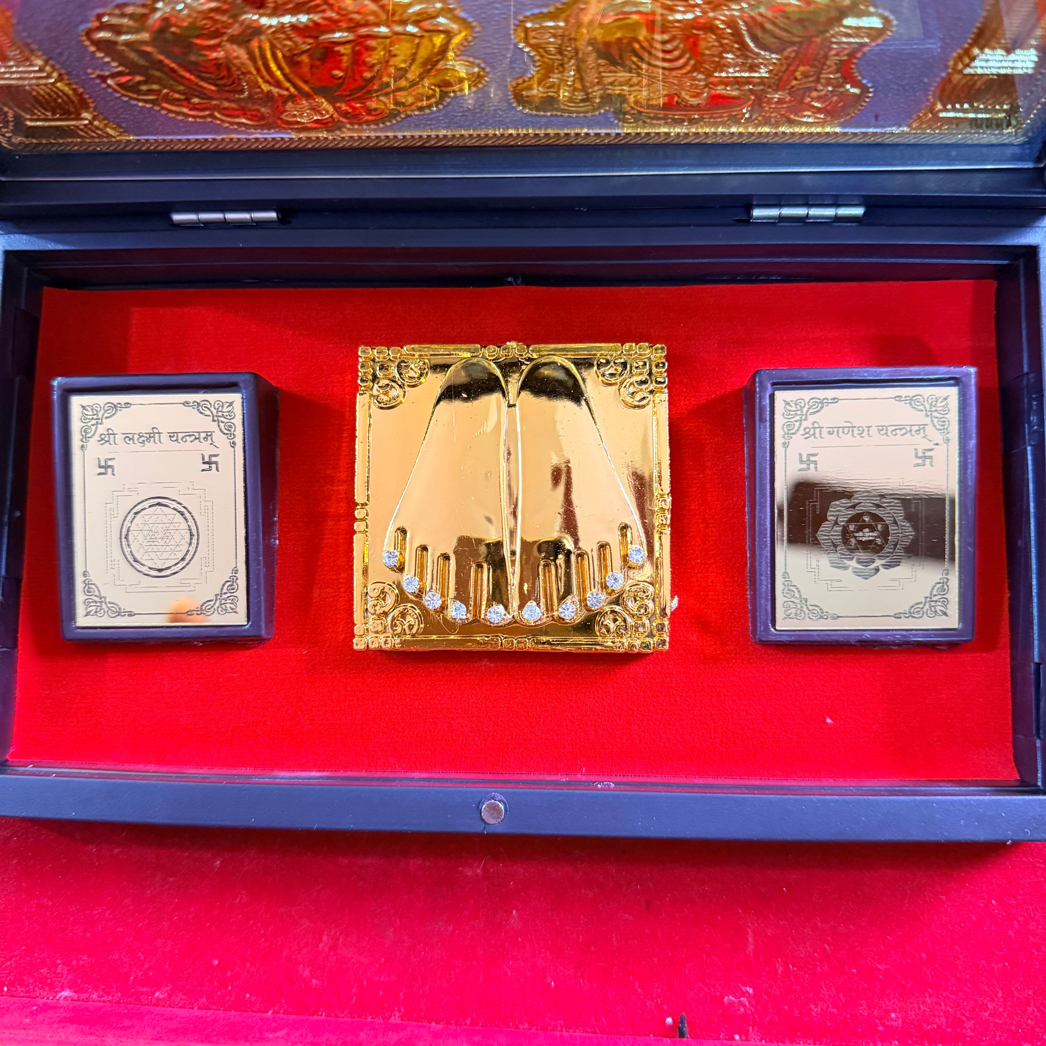 Commonly searched as Laxmi Ganesh charan paduka yantra, gold plated paduka for puja, and prosperity yantra.
