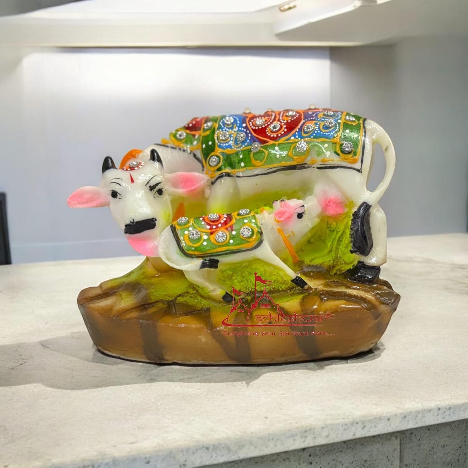 Achleshwar Kamdhenu Cow with Calf – Divine Figurine for Prosperity, Vastu, and Pooja Room Décor Size 9 cm