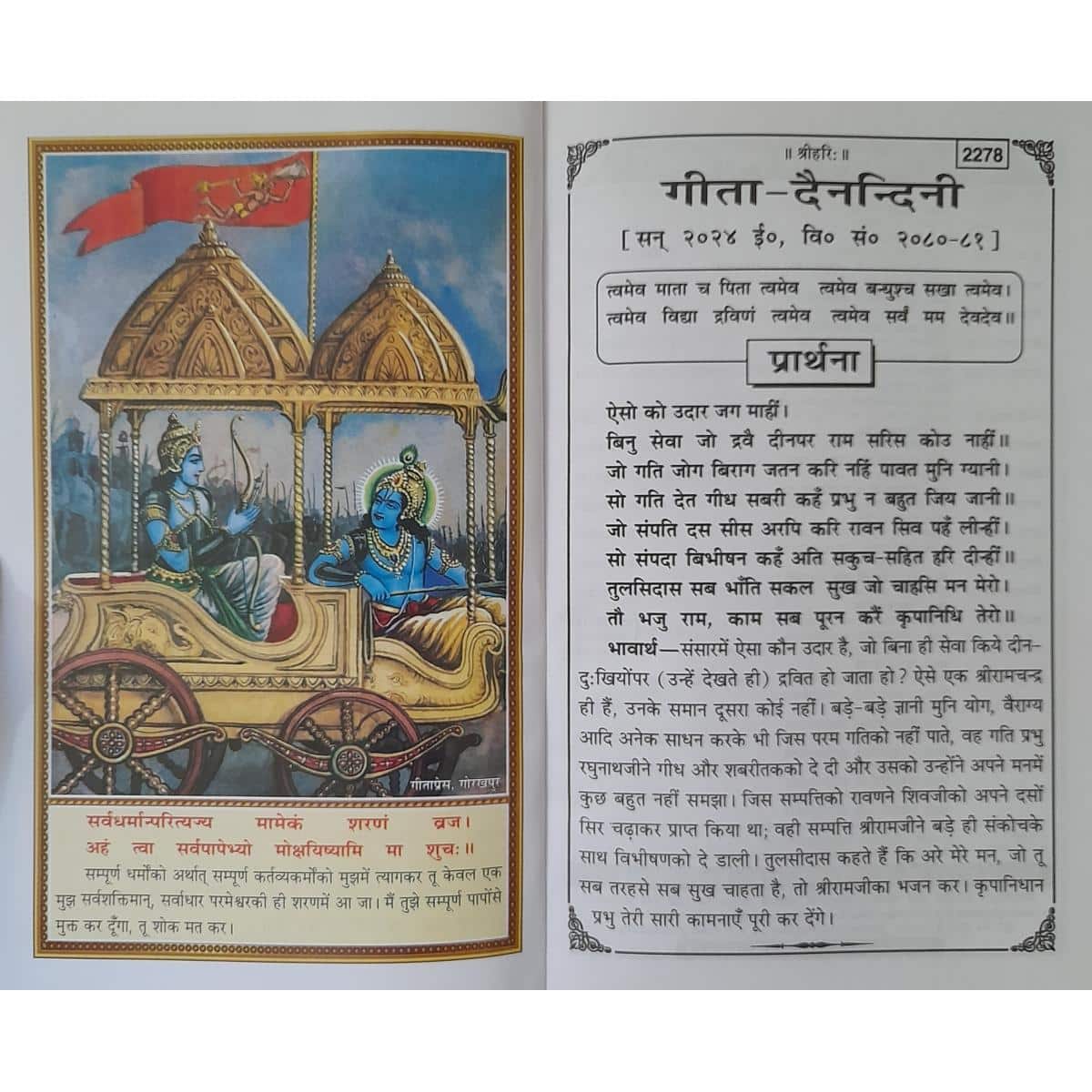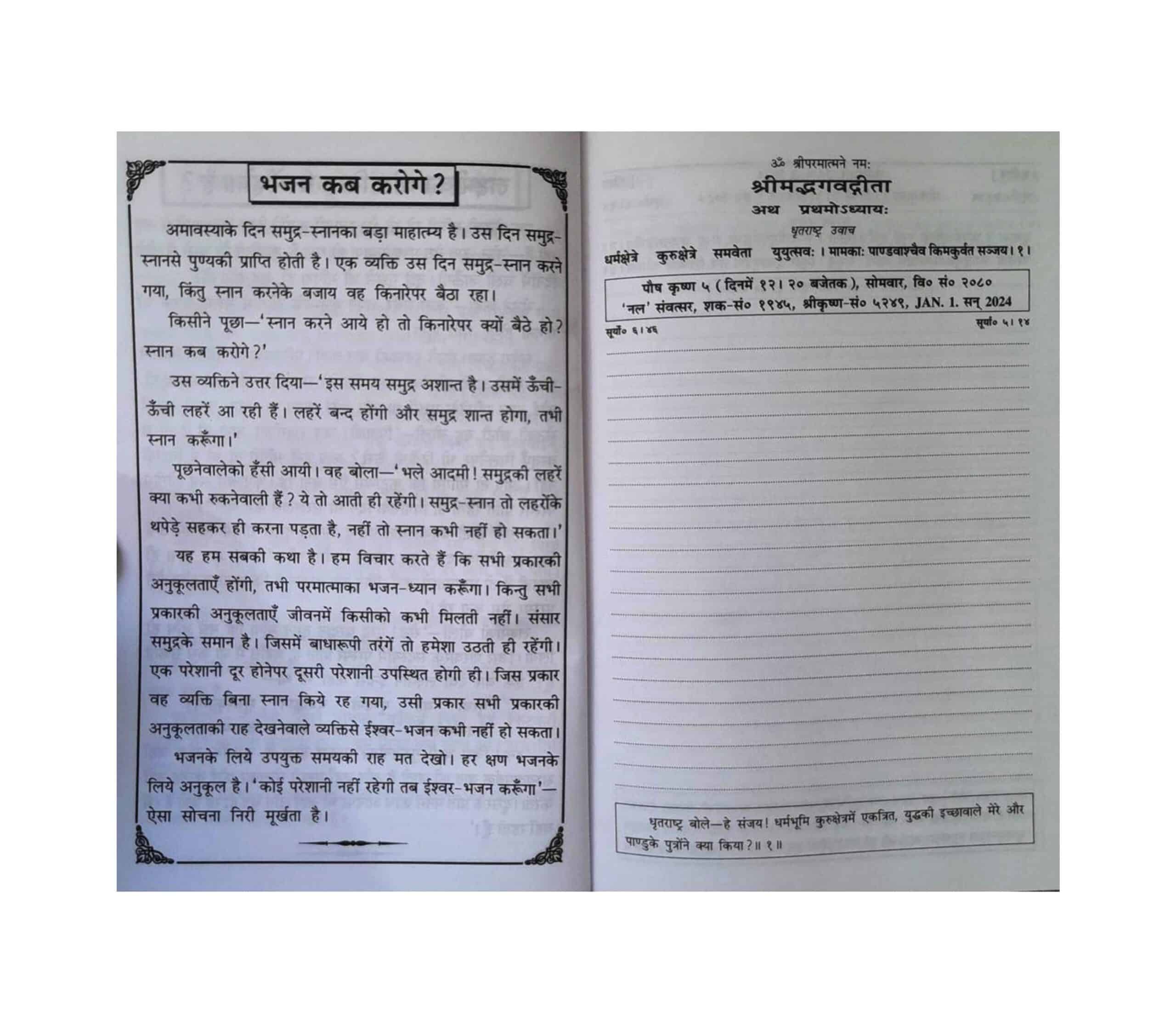 गीताप्रेस डायरी 2024 ने नए साल की शुरुआत गीता के श्लोकों के साथ की है, जो प्रत्येक पृष्ठ पर शीर्ष और नीचे होते हैं। यहां, हर श्लोक आपको ध्यान में रखता है और आपको एक आध्यात्मिक अनुभव में ले जाता है। डायरी का डिज़ाइन एक ऐसी राह प्रदर्शित करता है जो आपकी आत्मा को प्रेरित करती है, और इसके साथ, आप अपने दिन को सकारात्मक भावना में आरंभ कर सकते हैं।