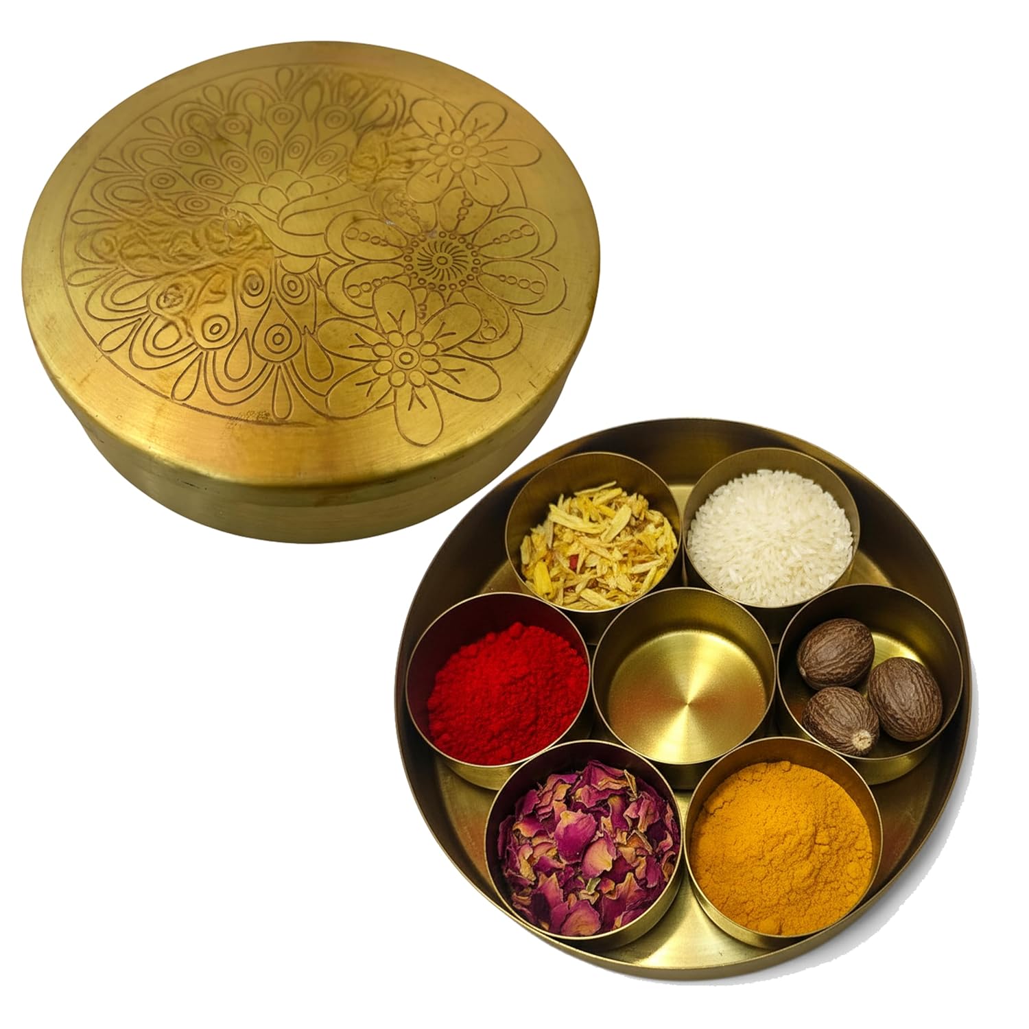 Achleshwar Brass Pooja Box | 7 Dibbi Set for Roli, Chawal, Haldi, Kumkum, Sindoor, Chandan, Turmeric | Traditional Brass Pooja Dani with Lid Holder for Festivals, Vrat & Daily Puja modified this title