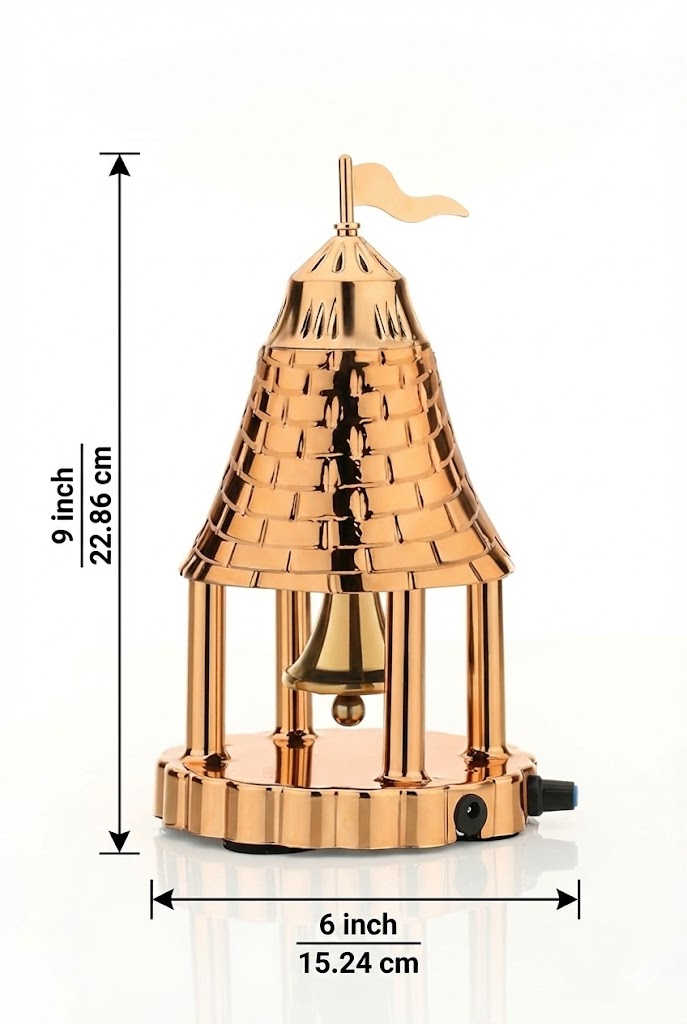 The Achleshwar Brass Automatic Electric Pooja Bell (6 x 9 Inch) is thoughtfully designed to bring convenience and devotion together. Crafted from high-quality brass with an elegant rose gold temple design, this automatic bell produces a clear, auspicious sound that enhances the spiritual ambiance of your puja space.