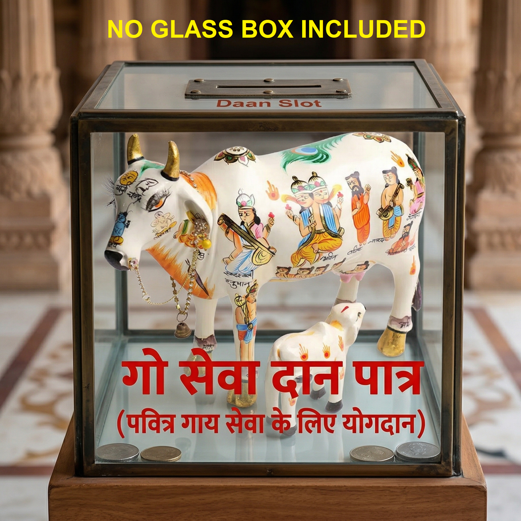 This handcrafted polyresin statue features intricate multicolour artwork depicting divine elements, making it both a spiritual and decorative piece. The presence of the calf enhances the symbolism of care, growth, and harmony.