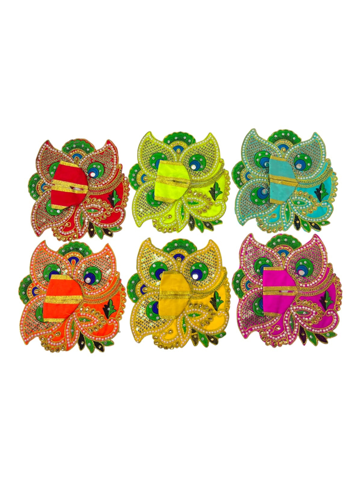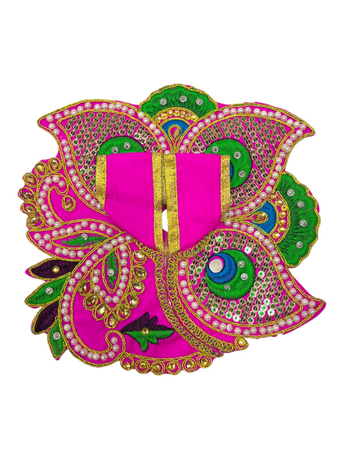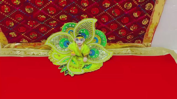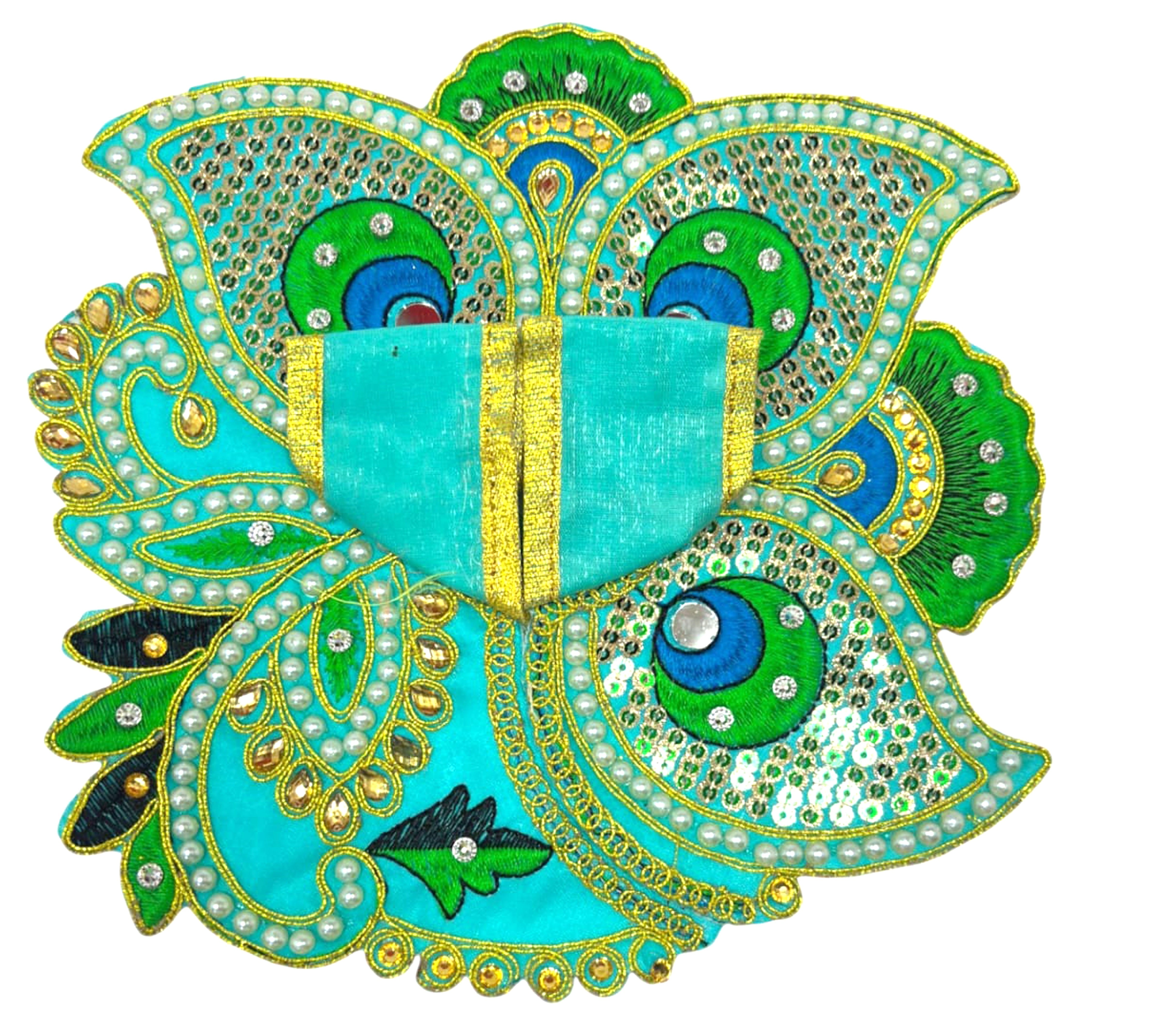 Adorn your beloved Laddu Gopal ji with this beautifully handcrafted Poshak, made with intricate Peacock Feather Embroidery . This dress is specially designed for small Bal Gopal idols, offering a perfect fit and a graceful temple look. The divine outfit features shimmering golden embroidery and delicate stones that enhance the charm and elegance of your Thakur ji. Ideal for daily darshan, Janmashtami, and pooja room decoration, this poshak is a symbol of devotion and traditional craftsmanship. Made with love and care, it brings vibrant energy to your mandir and radiates divine grace.Note: Color may vary, design remains the same. Handmade with variations that enhance its uniqueness.