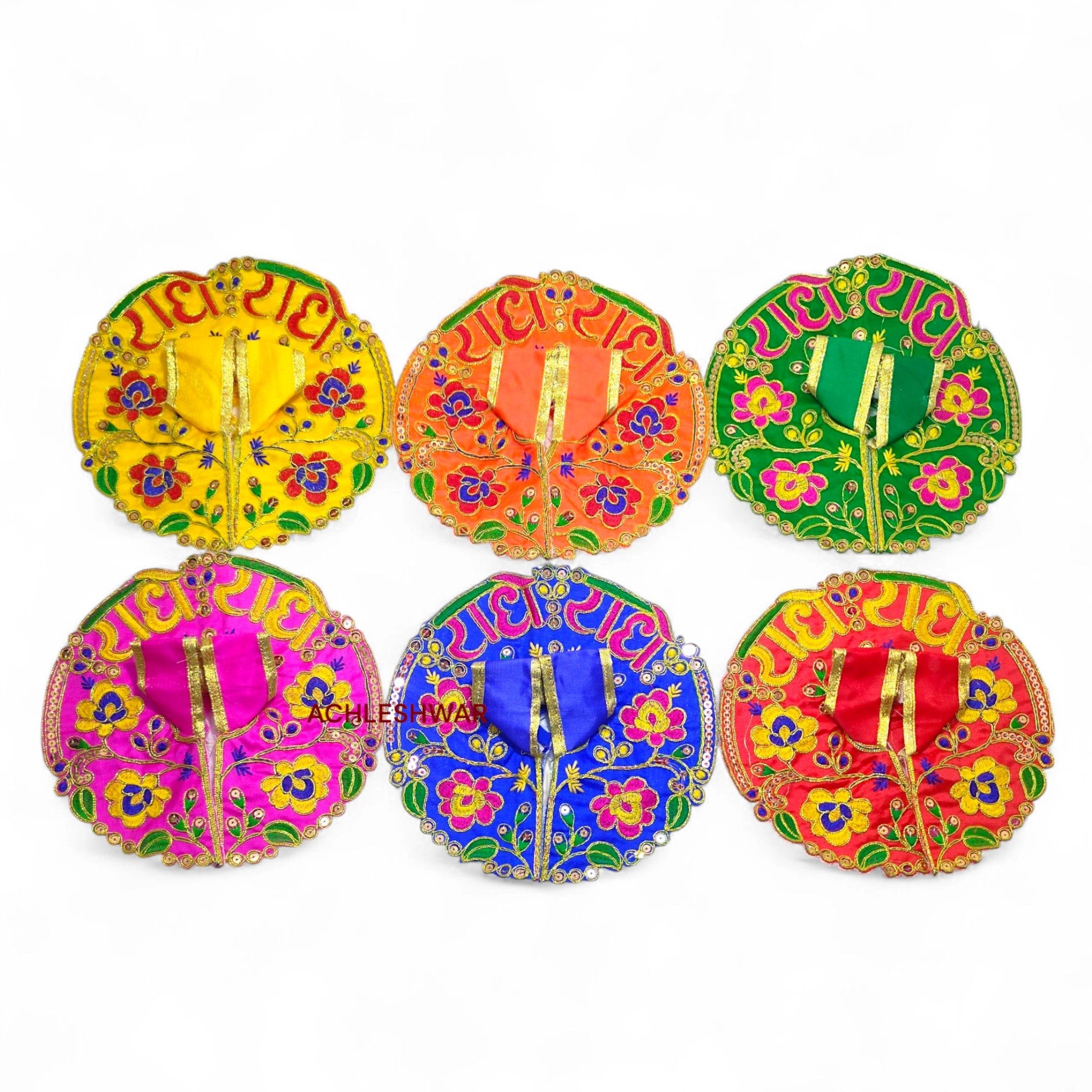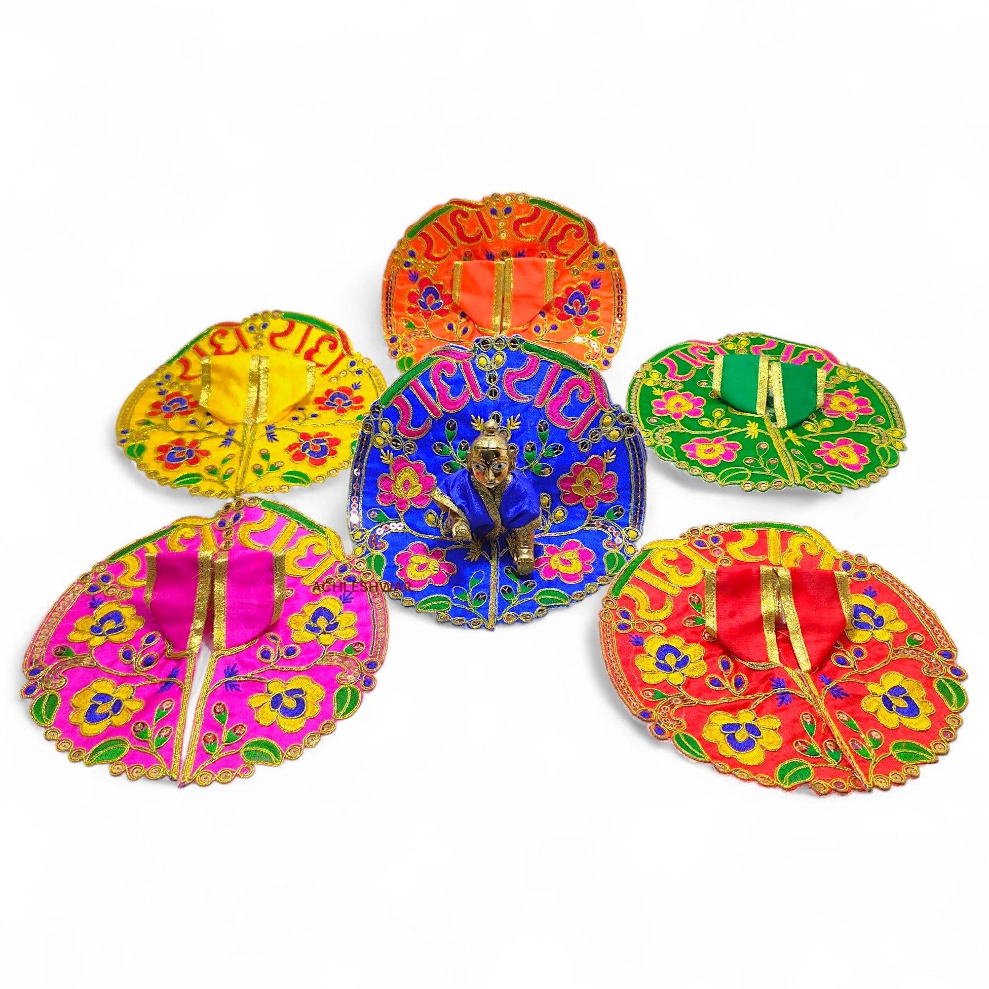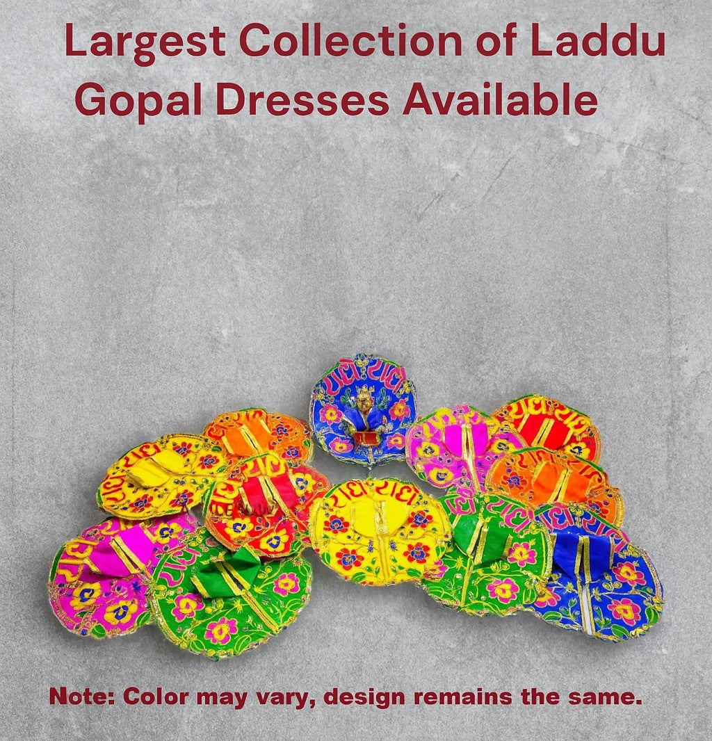 Dress your beloved Laddu Gopal in divine elegance with our Premium Radha Naam Shringar Poshak for Size 0 idols. This handcrafted dress set features delicate Jari work and stone embellishments, beautifully adorned with the sacred name "Radhey Radhey" intricately written on each piece. Designed specially for small idols, each poshak offers a perfect fit, vibrant colors, and a spiritual charm ideal for daily darshan, Janmashtami, or festive puja. The premium-quality fabric is gentle on your Thakur Ji’s murti and enhances the divine aura of your home mandir. This devotional attire truly reflects love and devotion toward Laddu Gopal.e.Note: Color may vary, design remains the same. Handmade with variations that enhance its uniqueness.